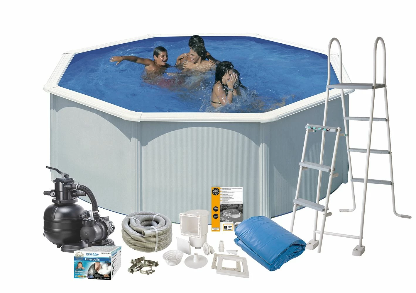 Het meegeleverde filtersysteem beschikt over de juiste capaciteit om schoon en uitnodigend water tegaranderen.Het grote accessoire-pakket omvat de in de wand geïntegreerde skimmer met retourleiding, allenodige slangen, filterballen en een veiligheidsladder met 3 treden.
