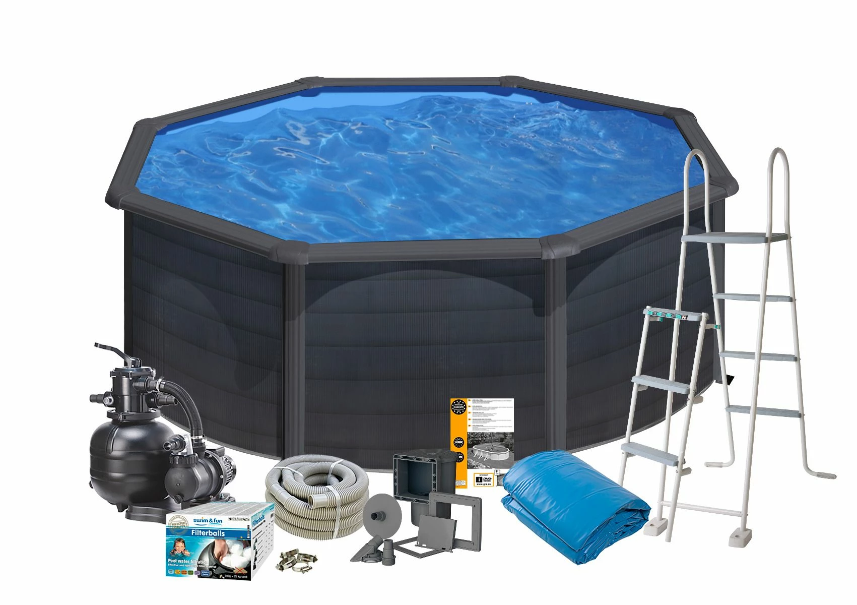 Het meegeleverde filtersysteem beschikt over de juiste capaciteit om schoon en uitnodigend water tegaranderen.Het grote accessoire-pakket omvat de in de wand geïntegreerde skimmer met retourleiding, allenodige slangen, filterballen en een veiligheidsladder met 3 treden.
